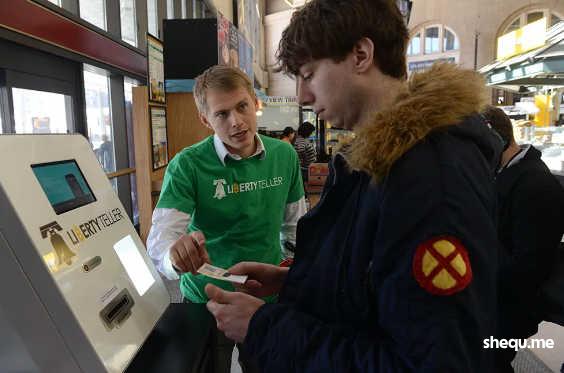 2014年2月20日,在马萨诸塞州交通枢纽波士顿南站,Liberty Teller公司的工作人员帮助客户从一台新安装的比特币ATM机上购买比特币