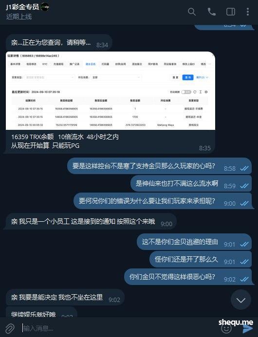 后来我们也认了,我们大家都拿赢来的钱去重新打流水,但是平台这两天都被他们控起来了,你怎么打都不会给分,除非过了48小时等我们打不够流水,扣除我们账号的钱才会给点分,我总共七万多TRX,合成美金有几千吧,打了半天,分杀光了,而且七万多资金才给了一百多人民币的水。